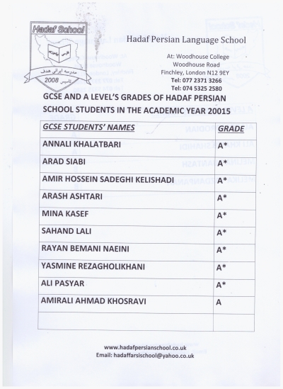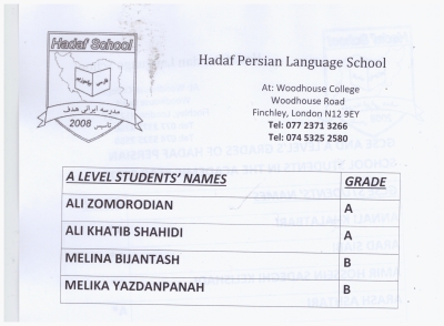 CONGRATULATION: The Results of the GCSE test for Persian for academic years 2011, 2012, 20013, 2014, 2015 and academic year 2016, 2017, 2018 , 2019 -20, 2020-21, and 2021-22 for all Hadaf Students were: A*- A: 100%. So Hadaf Persian School saying a Golden Well Done to all our students for their hard working and Huge Thanks to their wonderful teachers. - Hadaf Persian School is a well known supplementary school in the London Borough of Barnet located in North of London and based in Woodhouse College N12 9EY. It was established in 2008. The school is open each Saturday from 1.30 pm to 4.30pm. - The main aim of the school is to provide Persian language courses to second generation Iranian children from Reception and Pre-School to year 5 in Primary School and running GCSE Persian Language in Secondary School. The school was established to respond the needs of our community as the parents felt their children were starting to lose contact with their mother-tongue and culture. Parents also found it increasingly difficult to communicate with their children due to the language barrier. - Also this school is keen to support children in Maths lessons up to A- level of English Schools Programes on the parents request and on separate Tuition Fees for groups or private mode. With so much proud and saying Big Congratulation to our students and their parents, we got the GCSE & A-Level Persian Exam Results for Academic Year 2012-13 that is shown below: